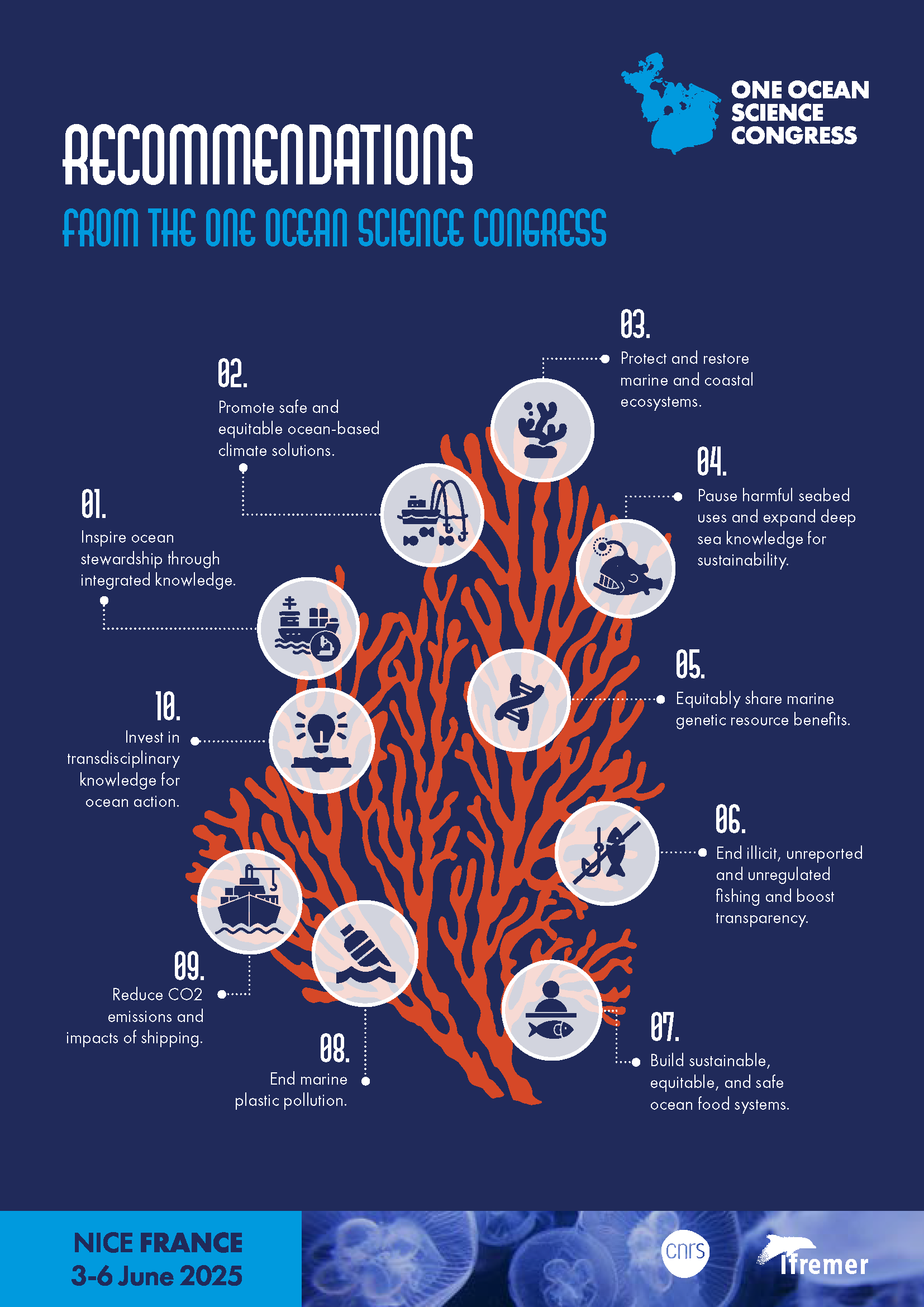 CNRS and IFREMER have been tasked with organizing the One Ocean Science Congress (OOSC), a UNOC3 Special Event dedicated to Science, and to provide Heads of State, Government, and the broader society, with comprehensive scientific insights on the Ocean's health and future trajectory. Science-informed decisions should enable the conservation and sustainable use of the Ocean, optimize the solutions it offers, and safeguard the services and benefits it provides to humanity.